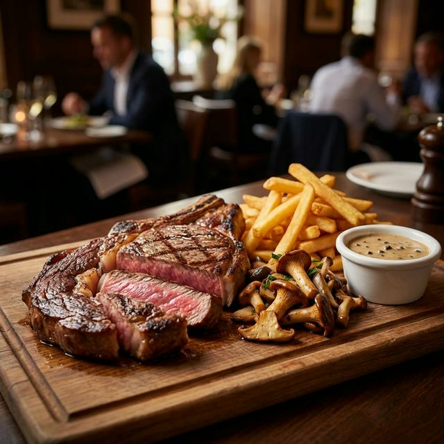 KES 28.50300g ribeye steak served with fries, wild mushrooms, and peppercorn sauce.